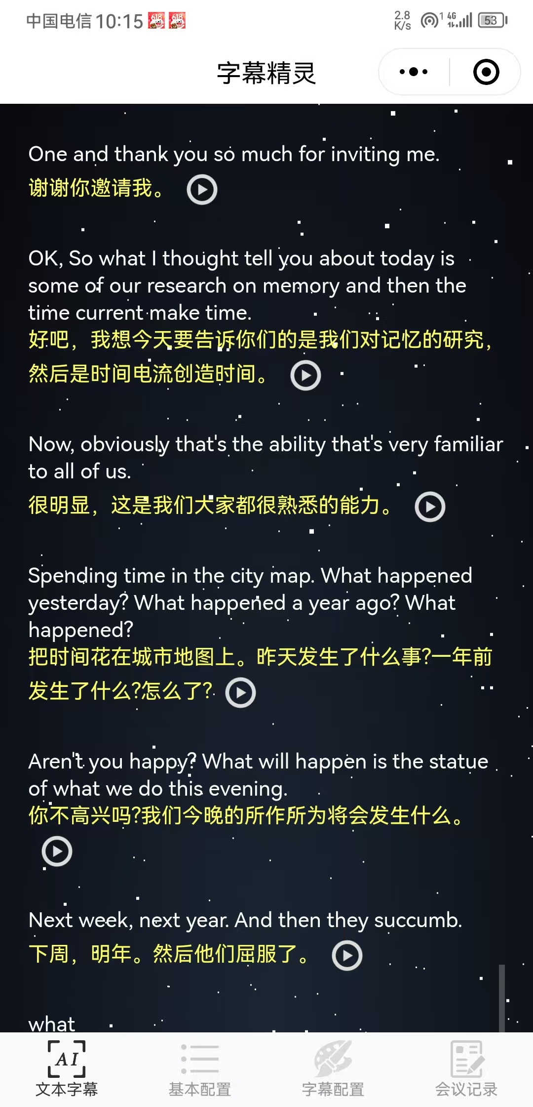 在整个学术包期间,唐帕翻译字幕精灵的手机端分享功能,展现了其多场景应用的强大实力,教授台上发言,台下直接用手机扫码即可从手机端查看翻译内容。